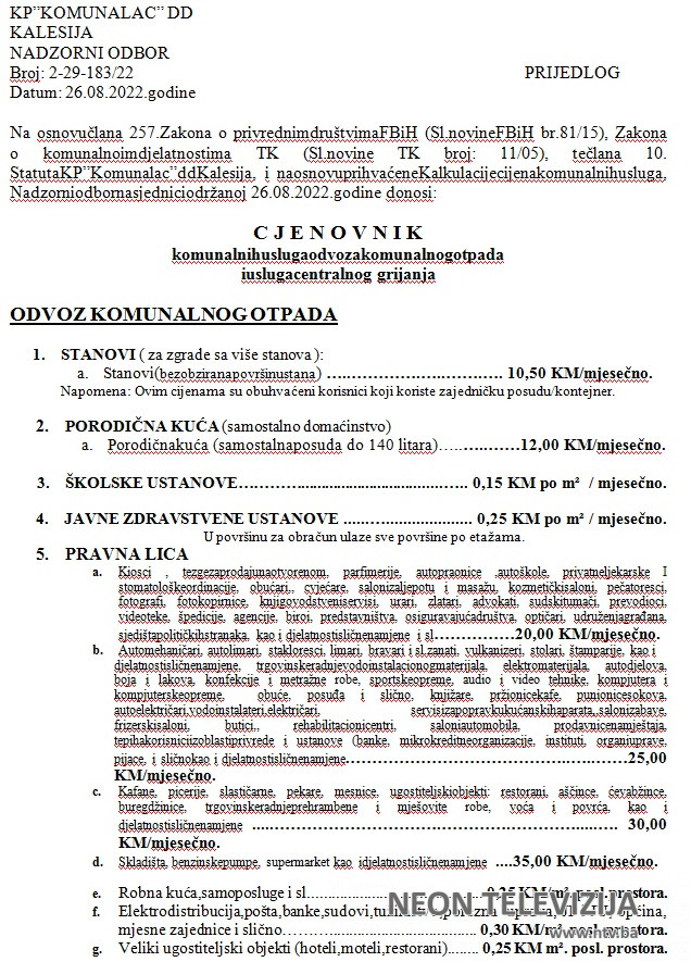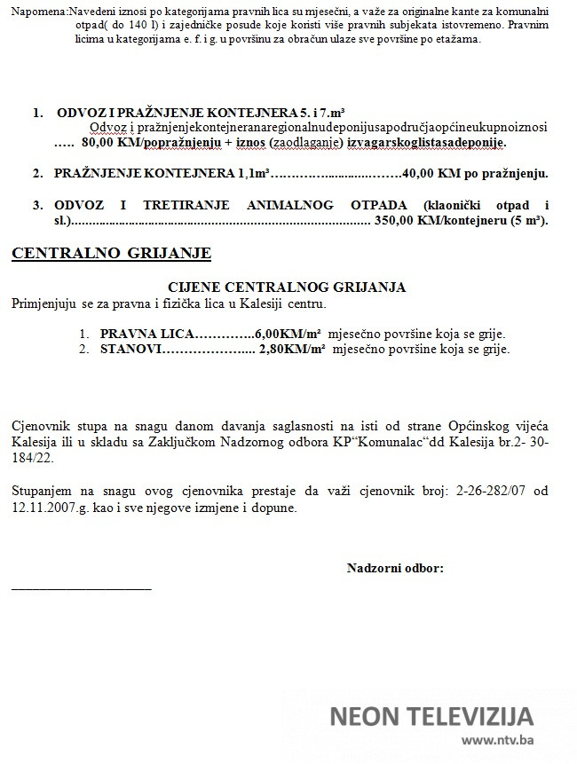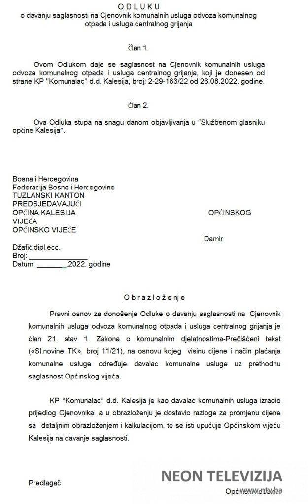 Za 16. redovnu sjednicu OV Kalesija, zakazanu za četvrtak (01.12.2022.) je planirana tačka dnevnog reda – “Razmatranje i donošenje Odluke o davanju saglasnosti na Cjenovnik komunalnih usluga odvoza komunalnog otpada i usluga centralnog grijanja”.