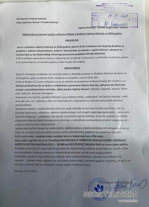 Zbog toga je Narod i Pravda dostavila svoje prijedloge za Budžet Općine Kalesija za 2022.godinu.