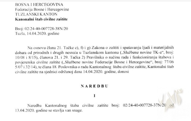 Nakon što je upozorenje stiglo sa Federalnog nivoa, odnosno nakon što je Fahrudin Solak, komandant Federalnog štaba civilne zaštite upozorio Kantonalni štab da ne smije donositi naredbe bez njegove saglasnosti, te da spornu naredbu povuče, Kantonalni štab danas je odluku stavio van snage.
