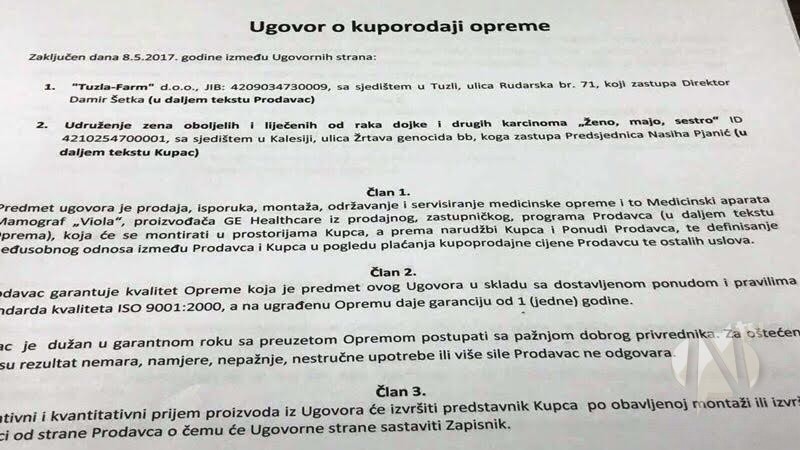 Udruženje “Ženo, majko, sestro…” i farmaceutska kuća “Tuzlafarm” su 08.05.2017. potpisali Ugovor o kupoprodaji mamografa “VIOLA”, proizvođača GE Helthcare, standarda kvalitete ISO 9001:2000, uz garanciju na jednu godinu.