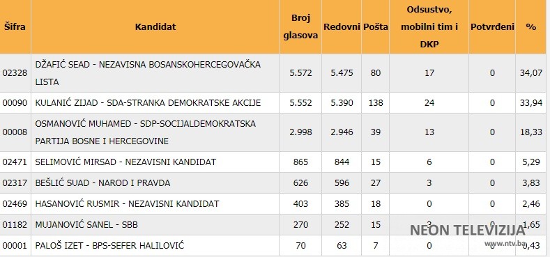 Prema novim preliminarnim rezultatima, Sead Džafić ima 20 glasova više u odnosu na Zijada Kulanića.