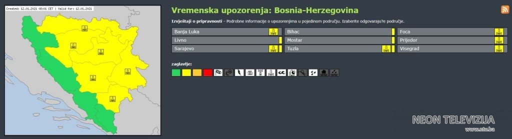 Meteoalarm je upaljen za područje gradova Banjaluka, Livno, Sarajevo, Bihać, Mostar, Tuzla, Foča, Prijedor i Višegrad zbog niskih temperatura.