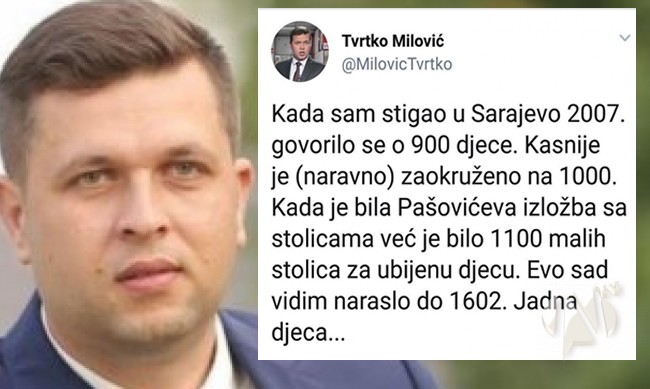 – Kada sam stigao u Sarajevo 2007. govorilo se o 900 djece. Kasnije je, (naravno), zaokruženo na 1000. Kada je bila Pašovićeva izložba sa stolicama već je bilo 1.100 malih stolica za ubijenu djecu. Evo sad vidim naraslo na 1602. Jadna djeca… – napisao je Milović.