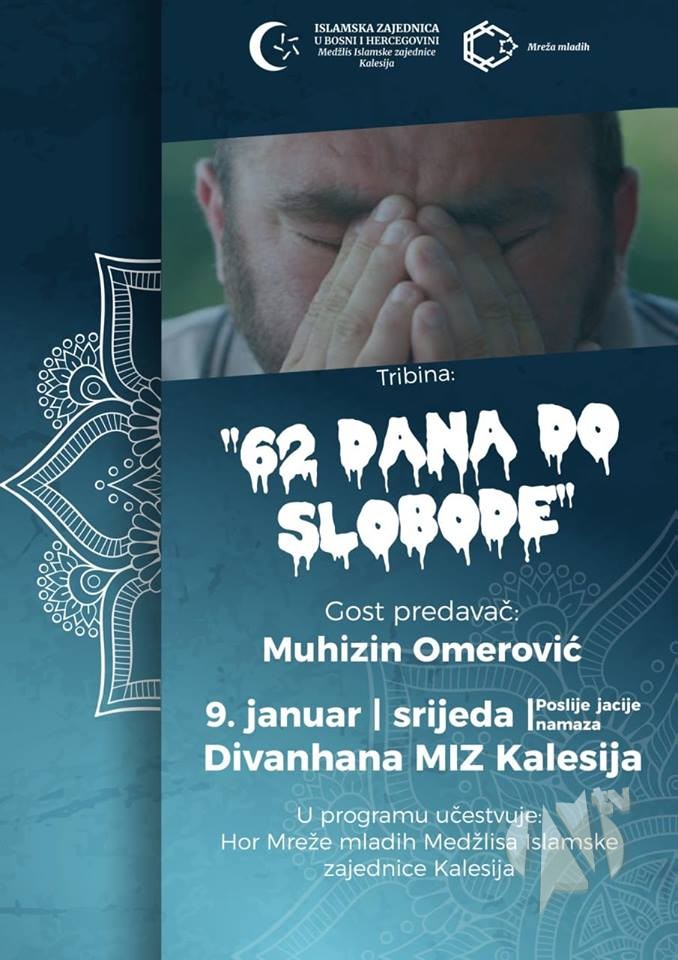 Istog dana, u 18,30 sati, poslije jacije, u divanhani Medžlisa IZ Kalesija, bit će održana tribina pod nazivom “62 dana do slobode”. Gost predavač je Muhizin Omerović, profesor teologije iz Pobuđa kod Bratunca. Omerović je 11. jula 1995. krenuo sa mnogim Srebreničanima u koloni smrti prema Tuzli. Na slobodnu teritoriju je stigao nakon 62 dana. Na tribini će govoriti o zločinu genocida u Srebrenici.