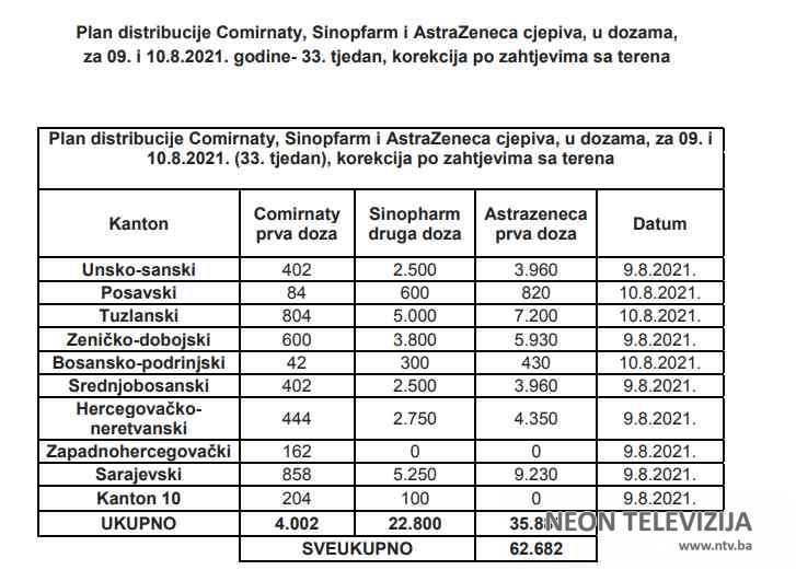 Zavod za javno zdravstvo Federacije BiH objavio je plan distribucije vakcina protiv COVID-19, Comirnaty, Sinopharm i AstraZeneca u dozama za 9. i 10. august po kantonima. Ukupno će biti distribuirano 62.682 doze.