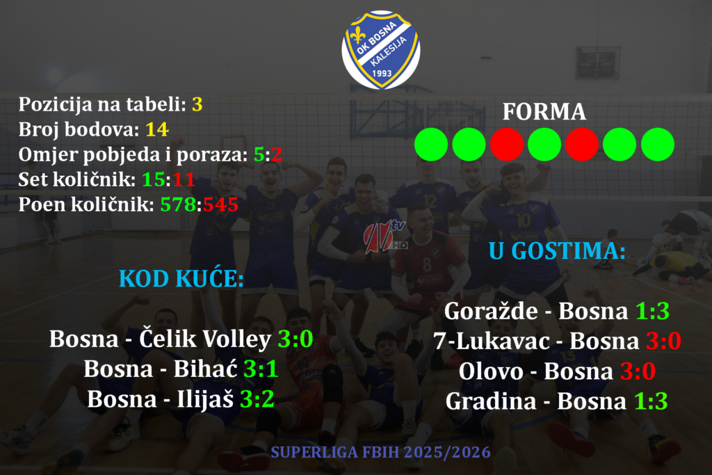 Završen je prvi dio sezone Superlige FBiH za odbojkaše. Nakon prvog kruga takmičenja na vodećoj poziciji nalazi se ekipa Lukavca sa maksimalnim učinkom – sedam pobjeda i 21 bodom. „Sedmicu“ prati ekipa Olova, drugoplasirana sa 18 bodova, dok je na trećem mjestu kalesijska Bosna sa 14 osvojenih bodova. Nakon ispadanja iz Premijer lige prošle sezone, Bosna je u aktuelnoj takmičarskoj godini dodatno podmladila sastav. Okosnicu tima čine kadeti i juniori koji su prethodnih godina ostvarivali zapažene rezultate u omladinskim kategorijama, a ove sezone su pod vodstvom trenera Nedžada Imamovića dobili priliku za punu afirmaciju u seniorskoj konkurenciji. Zbog toga je rezultatski imperativ stavljen u drugi plan, dok je kao primarni cilj istaknut razvoj domaćih talenata koji bi u godinama koje dolaze trebali biti okosnica povratka kluba na vrh bh. odbojke.