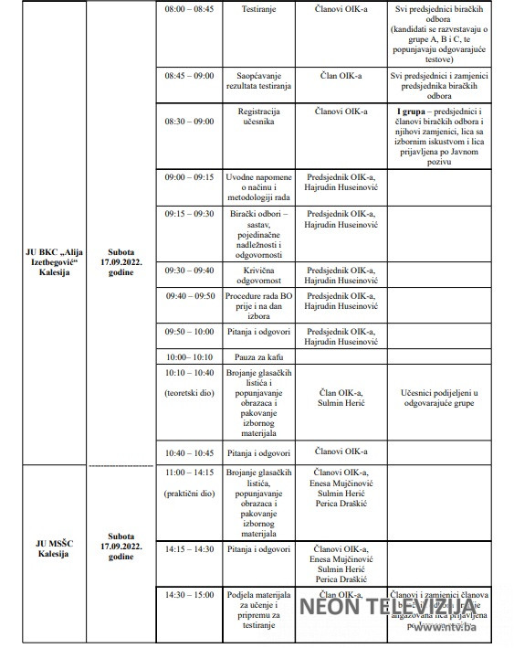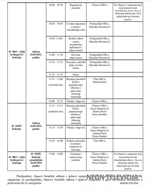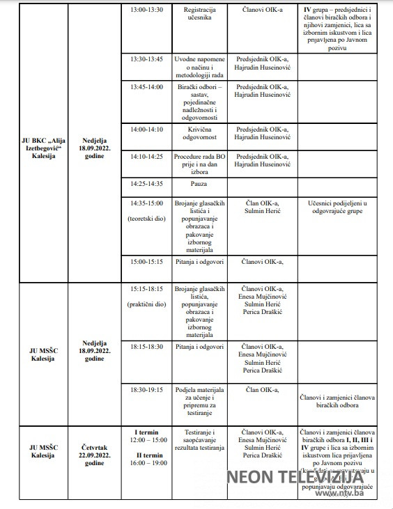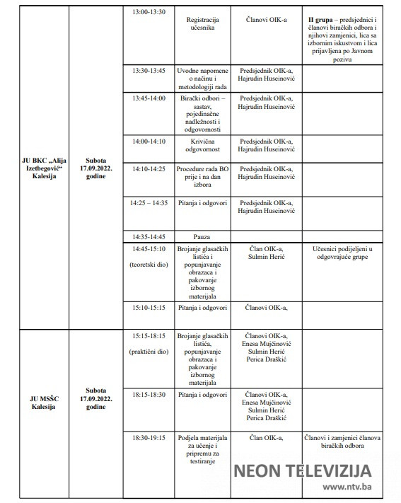 Hercegovine”, broj:27/22), obavezni su prisustvovati obuci koju Općinska izborna komisija Kalesija (u daljem tekstu:OIK) organizuje za predsjednike i članove biračkih odbora i njihove zamjenike, kako slijedi: