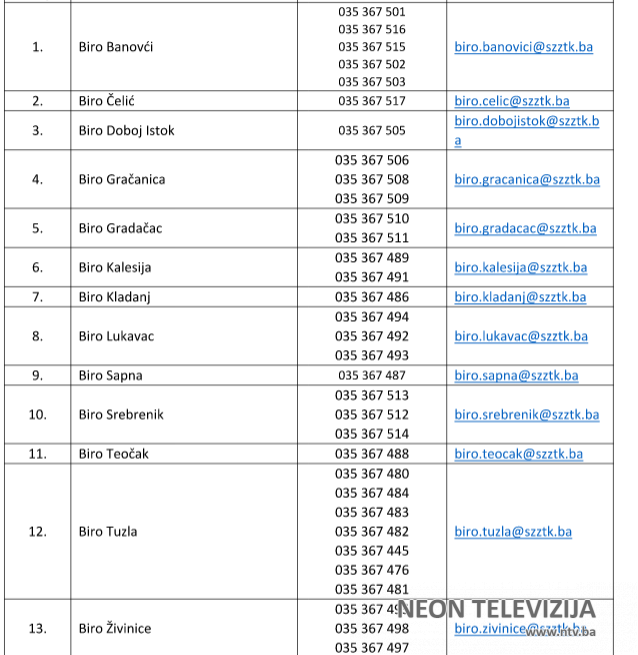 | Biro Kalesija | 035 367 489035 367 491 | biro.kalesija@szztk.ba |