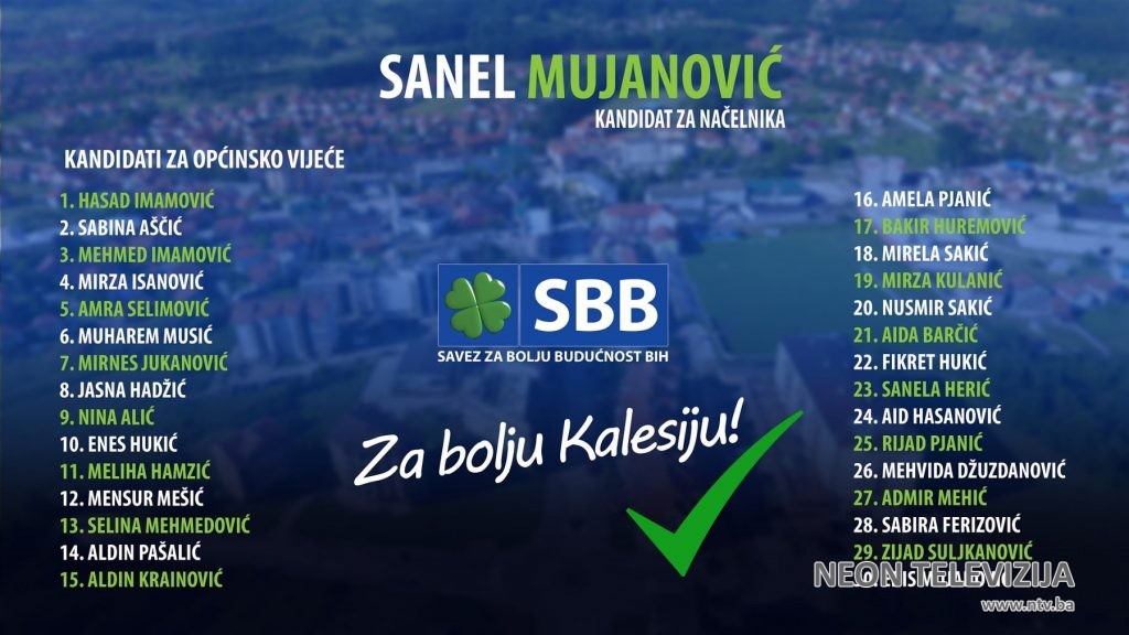 Na ove lokalne izbore SBB je izašao sa konkretnim planom koji namjerava realizovati u naredne 4 godine, kako bi stanovnicima Općine Kalesijepoboljšao uslove života. Važno je još napomenuti da su u pitanju lokalni izbori, koji imaju za svrhu da u Općinska vijeća dođu ljudi koji će raditi za dobrobit lokalne zajednica, a ne kako smo svjedoci, promocija ideja i planova koji su za više nivoe vlasti. SBB Kalesija izlazi sa listom kandidata čiji je prosjek godina 35. To su mladi ljudi, u zenitu fizičke i mentalne snage, ostvarene ličnosti na poslovnom i porodičnom planu, roditelji maloljetne djece, ljudi čista obraza i poštovani u svojim mjesnim zajednicama.
