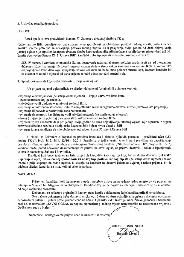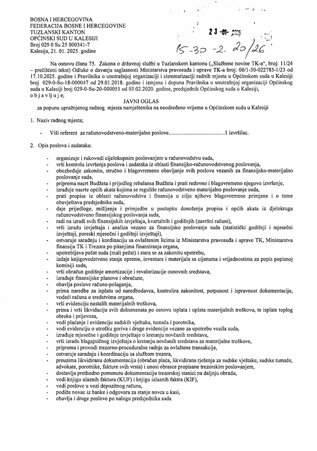 Općinski sud u Kalesiji raspisuje javni oglas za popunu upražnjenog radnog mjesta namještenika na neodređeno vrijeme na poziciju: Viši referent za računovodstveno materijalne poslove (1 izvršilac).