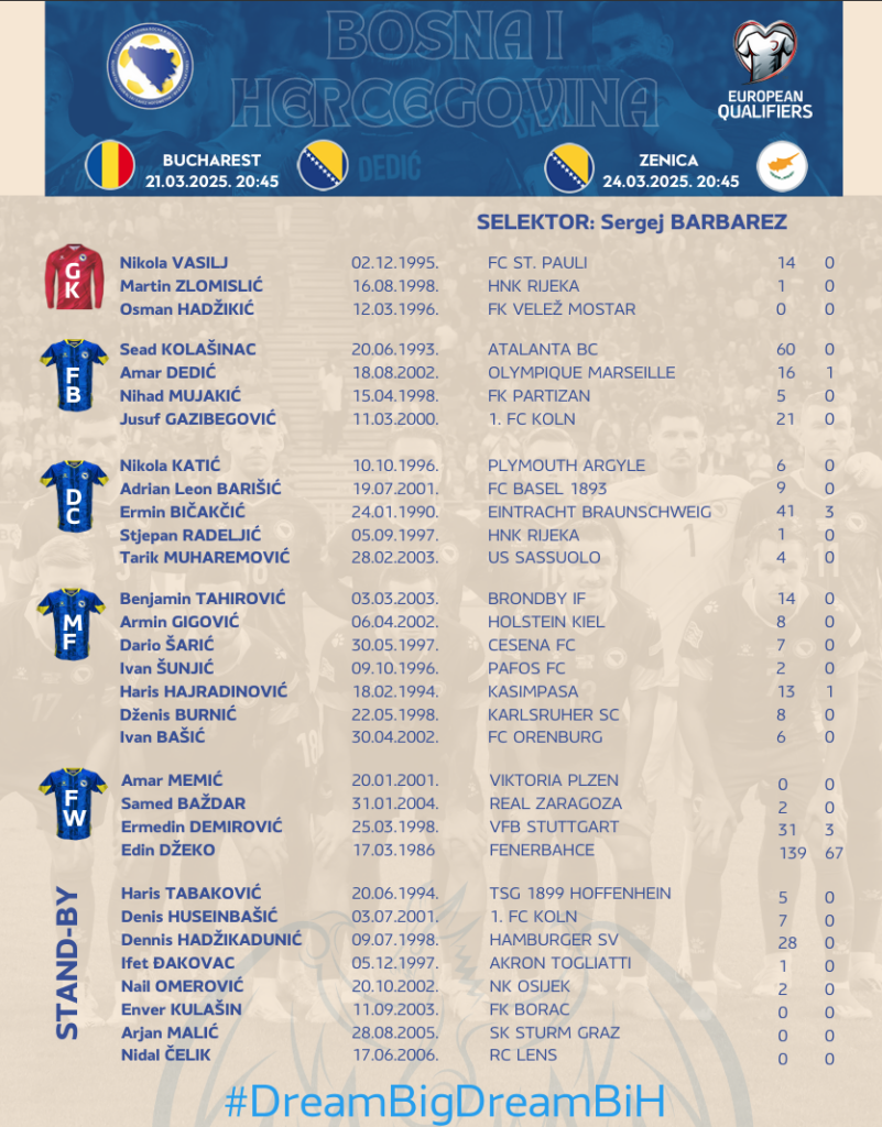 Selektora Sergeja Barbareza može radovati činjenica da je većina reprezentativaca igrala za vikend u svojim klubovima, te da se Ermedin Demirović vraća u golgetersku formu. No, ono što može zabrinuti Barbareza je povreda Jusufa Gazibegovića. Za sada nije poznat stepen ozbiljnosti povrede niti to da li će selektor Zmajeva pozvati nekoga sa rezervnog spiska.