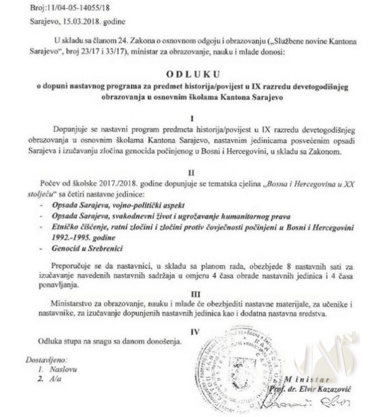 Riječ je o odluci ministra za obrazovanje, nauku i mlade Elvira Kazazovića donesenoj 15. marta, a koja tretira dopunu nastavnog programa za predmet historija za 9. razred u osnovnim školama. Time se zapravo dopunjuje već postojeća tematska cjelina “Bosna i Hercegovine u XX stoljeću”.