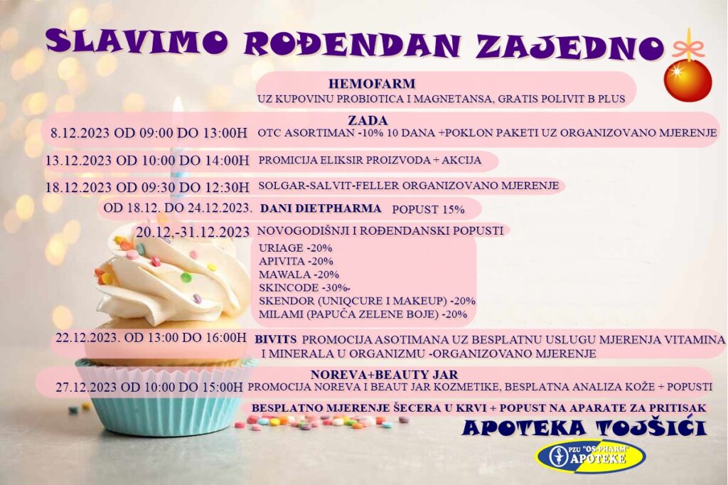 “Ponosni smo što nam već godinama dajete svoje povjerenje u odabiru proizvoda i usluga koje vam pružamo. Svakim danom nastojimo biti bolji, a najveći vjetar u leđa nam daje vaše zadovoljstvo i zdravlje. Ovaj put slavimo rođendan u našoj OS PHARM apoteci u Tojšićima uz magistralni put između hipermarketa Bingo i benzinske pumpe Polo te vas pozivamo da nas posjetite u toku mjeseca decembra i iskoristite priliku da vas počastimo.”, poručuju iz OS-PHARMA.