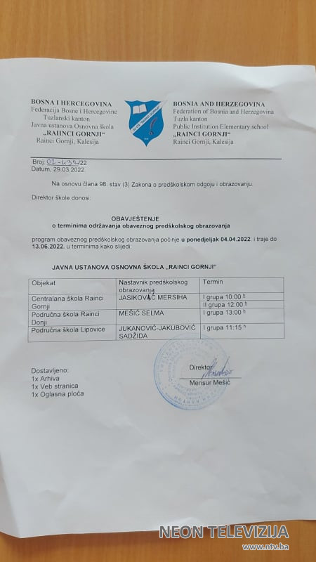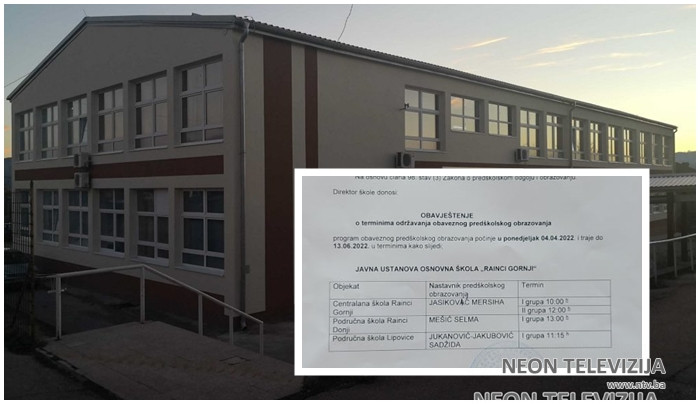 Iz JU OŠ Rainci Gornji dostavili su obavještenje o terminima održavanja obaveznog predškolskog odgoja.