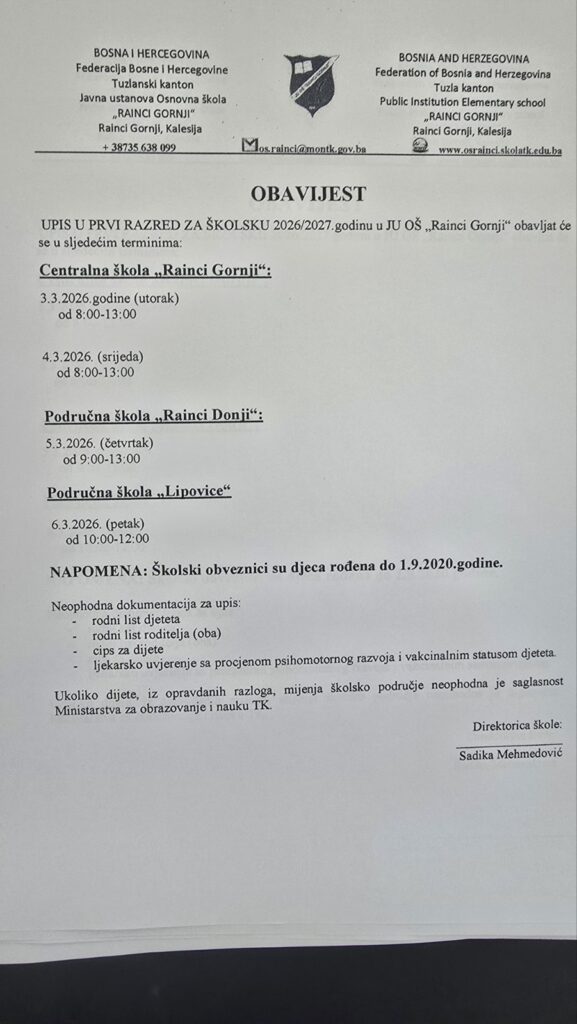 Upis u prvi razred školske 2026/2027. godinu u JU OŠ „Rainci Gornji“ obavljat će se u sljedećim terminima: