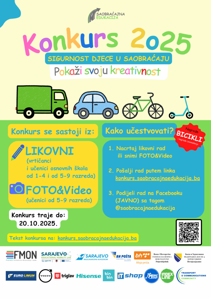 pokaži svoju kreativnost 2025“. Konkurs je otvoren za djecu predškolskog i školskog uzrasta u Bosni i Hercegovini. Djeca imaju priliku da kroz kreativnost i umjetnički izraz pokažu kako doživljavaju put, pravila i kulturu sigurnog kretanja.