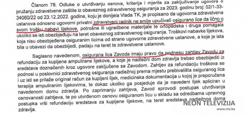 Također, prema Odluci (dostupnoj u nastavku teksta) Vlade TK, zdravstveni radnik ne smije upućivati osigurano lice da lično o svom trošku nabavi lijekove, potrošne ili ugradbene materijale, ortopedska i druga pomagala ukoliko se isti obezbijeđuju na teret obaveznog zdravstvenog osiguranja.