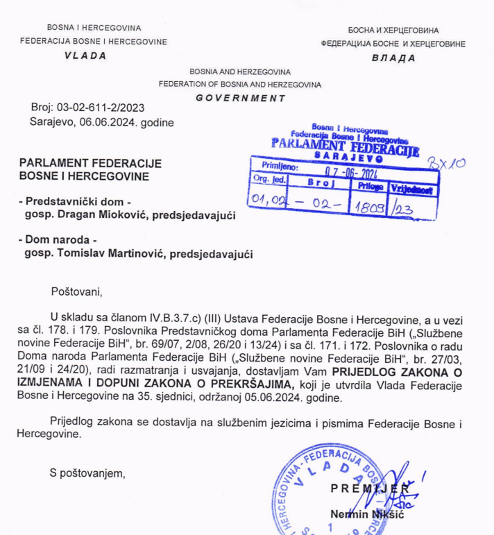 Tačnije, Prijedlog zakona o izmjenama i dopunama Zakona o prekršajima Federacije BiH, kojim su unaprijeđena zakonska rješenja i njihovo usklađivanje sa odlukama Ustavnog suda Bosne i Hercegovine usvojen je na sjednici 4. marta i stupio je na snagu prije 15 dana.