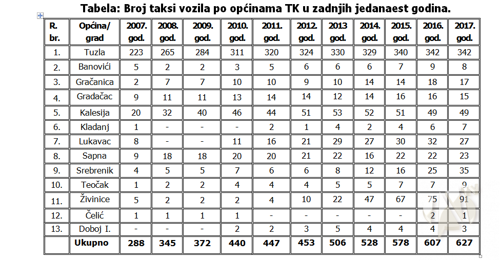 Ministarstvo je za taksi prijevoznike koji posjeduju Licencu za TAXI prijevoz i ostalu potrebnu dokumentaciju pristupilo izradi i izdavanju dopunskih oznaka za taksi vozila na području TK za 2018. godinu.Na području Tuzlanskog kantona u 2017. godini taksi djelatnost su obavljala 504 taksi prijevoznika sa 627 taksi vozila, od toga na području općine Kalesija 49 taksi vozila.