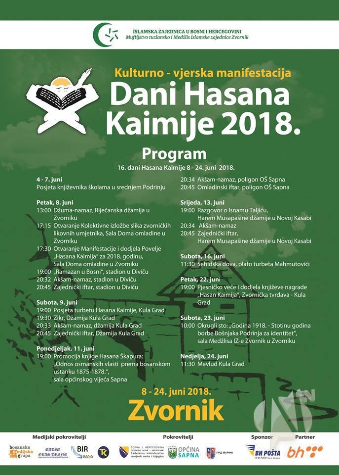 Danas, sa početkom u 17:30 sati, u sali Doma omladine u Zvorniku bit će svečano otvorena Kulturno-vjerska manifestacija “Dani Hasana Kaimije 2018. ”