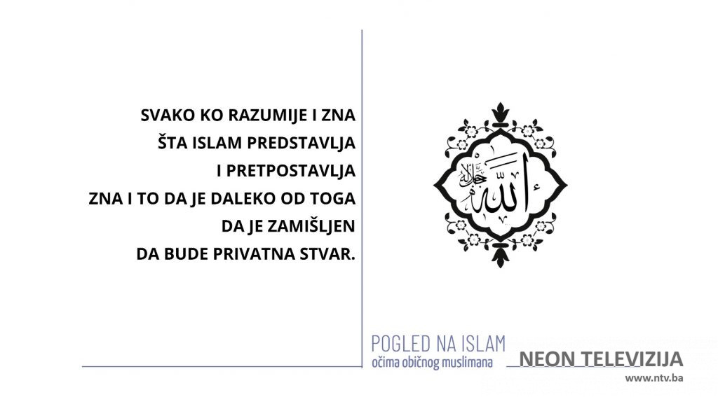 Da vjera nije i ne može biti privatna stvar jasno je kada znam da mi je propisala i precizirala kako da se ponašam u svojoj kući ali i na javnom mjestu, na ulici, u društvu, kako da obavljam svoj posao, bilo da sam trgovac, učitelj, stočar ili vladar. Najvažnije je da pri tome razumijem i prihvatim da su svi ti propisi tu iz jednog jedinog razloga – da moj život i život svih drugih ljudi koji me okružuju i sa kojima sam povezan na bilo koji način bude pravičan, pošten, moralan, koristan i ugodan.