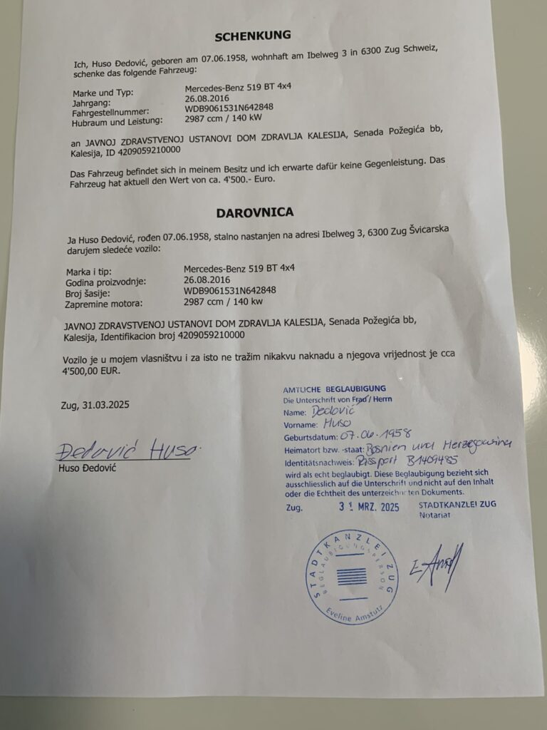 Huso Đedović danas je ključeve sanitetskog vozila uručio direktoru JZU Dom zdravlja Kalesija. Riječ je o drugom sanitetskom vozilu koje u 2025. godini uručeno kalesijskom domu zdravlja kao poklon građana Zuga.