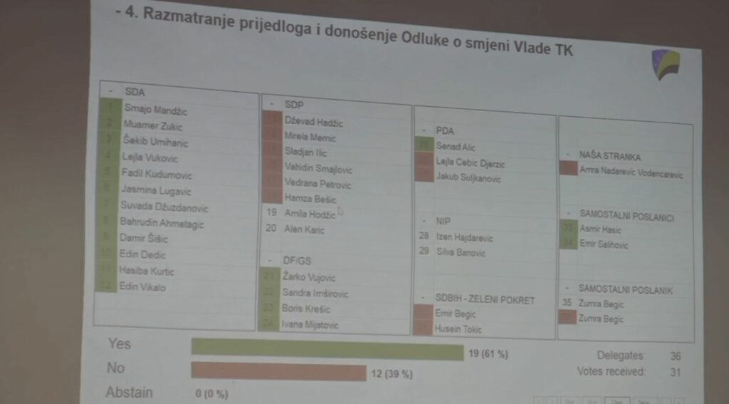 Uslijedilo je glasanje o povjerenju Vladi TK. Sa 19 glasova “za” izglasano je nepovjerenje Vladi TK koju je predvodio premijer Edis Dervišagić, a koja je imenovana prošlog četvrtka.
