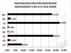 Najveći broj evidentirane nezaposlenosti čine lica sa trećim stepenom obrazovanja KV radnici 32,06%, zatim radnici sa SSS 28,07%, te NKV radnici 27,27%.