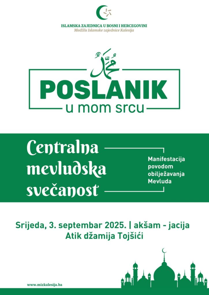 Centralna mevludska svečanost, kojom će i započeti kulturno-vjerska manifestacija „Poslanik u mom srcu 2025“, održat će se u Atik džamiji u Tojšićima, između akšama i jacije, u srijedu, 3. septembra 2025. godine, odnosno uoči 12. rebiul-evvela 1447. godine po Hidžri.