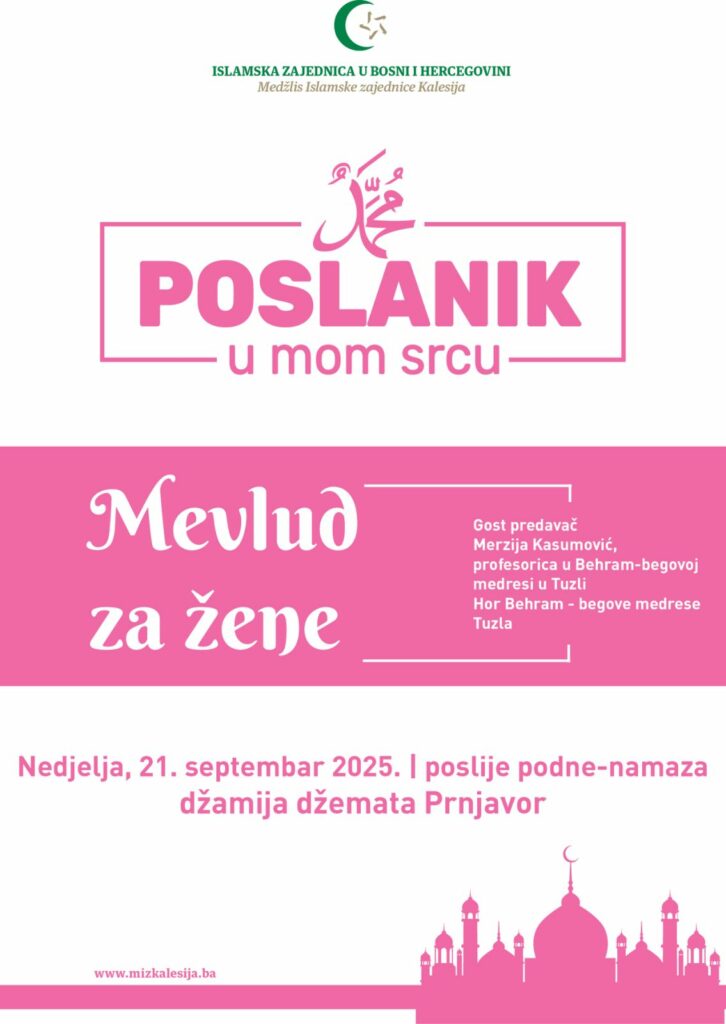 U okviru kulturno-vjerske manifestacije “Poslanik u mom srcu 2025”, u nedjelju, 21. septembra 2025. god., poslije podne-namaza, u džamiji džemata Prnjavor biće izveden mevludski program za ženski džemat.
