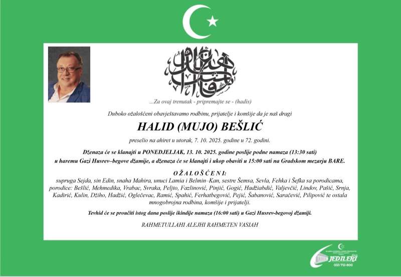 Dženaza-namaz Halida Bešlića klanjat će se u ponedjeljak, 13. oktobra, poslije podne namaza u 13:30 sati u haremu Gazi Husrev-begove džamije u Sarajevu, a ukop će se obaviti u 15 sati na Gradskom mezarju Bare.