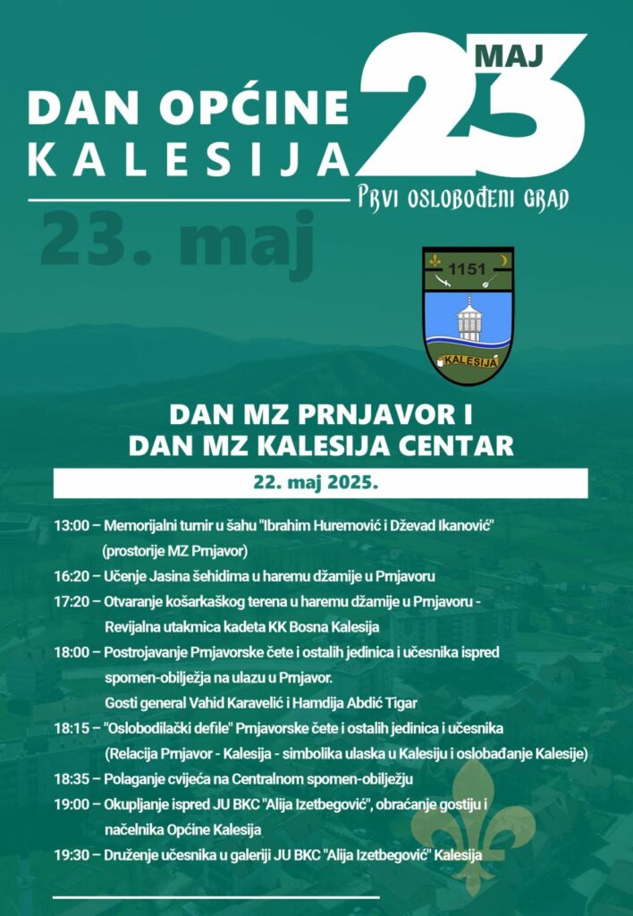 DAN OSLOBOĐENJA. U okviru programa predviđene su brojne aktivnosti, uključujući memorijalni turnir u šahu, učenje Jasina šehidima, otvaranje sportskog terena i revijalne utakmice, kao i svečano postrojavanje Prnjavorske čete i drugih učesnika. Program će biti upotpunjen simboličnim „Oslobodilačkim defileom“, polaganjem cvijeća na Centralnom spomen-obilježju, obraćanjem gostiju i načelnika Općine Kalesija, te prigodnim druženjem. Termini i satnica nalaze se u prilogu na Pozivnici. Radujemo se Vašem dolasku i zajedničkom obilježavanju ovog značajnog dana za naše mjesne zajednice.“