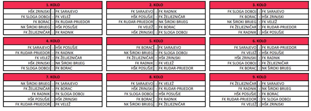 Prvo kolo je na programu 26. i 27. jula ove godine. Podsjećamo, u prvenstvu BiH ove sezone će igrati deset klubova, a prvenstvo se igra po četverokružnom sistemu.