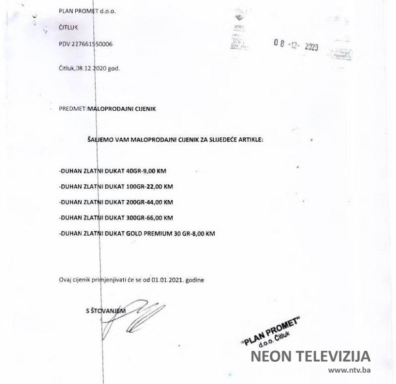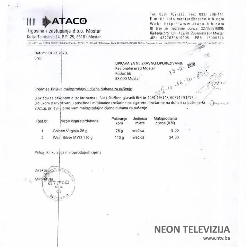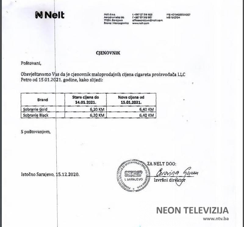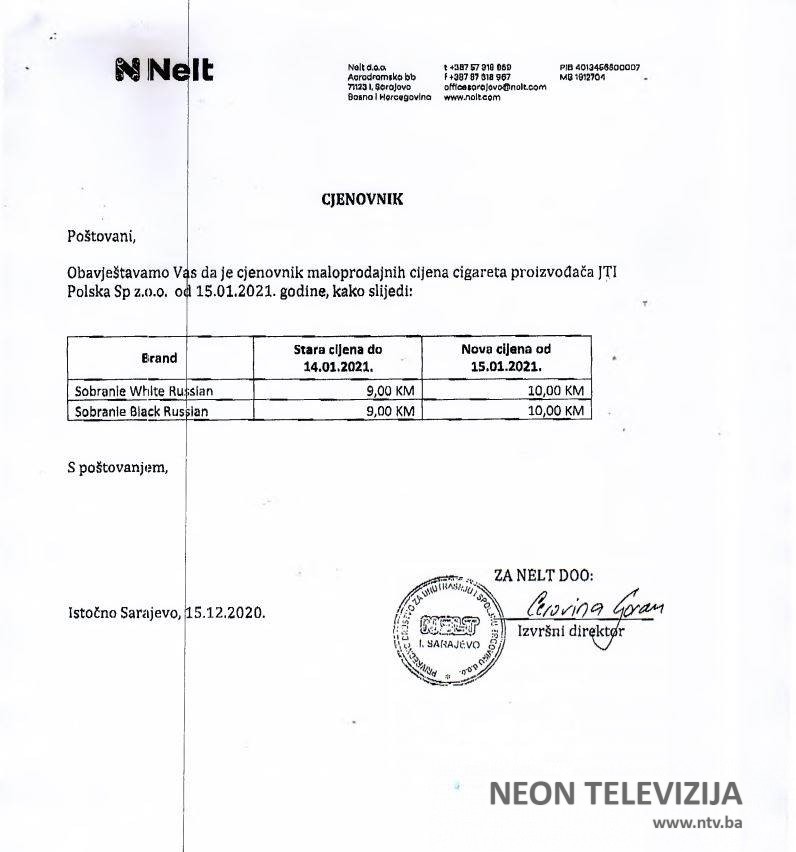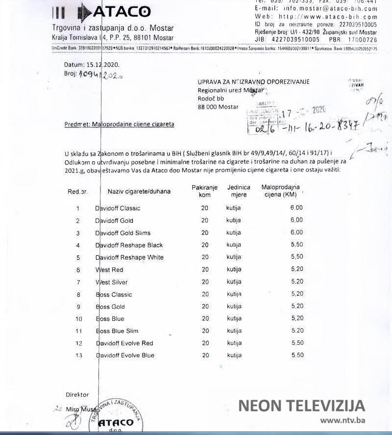 Proizvođači i distributeri duhana i duhanskih prerađevina imali su rok do 15. decembra da Upravi za indirektno oporezivanje BiH dostave nove maloprodajne cijene cigareta i duhana. Do sada su cijene dostavila četiri proizvođača.