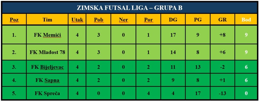 Večerašnjim utakmicama petog kola grupe B završena je grupna faza drugog izdanja Zimske futsal lige u Kalesiji.