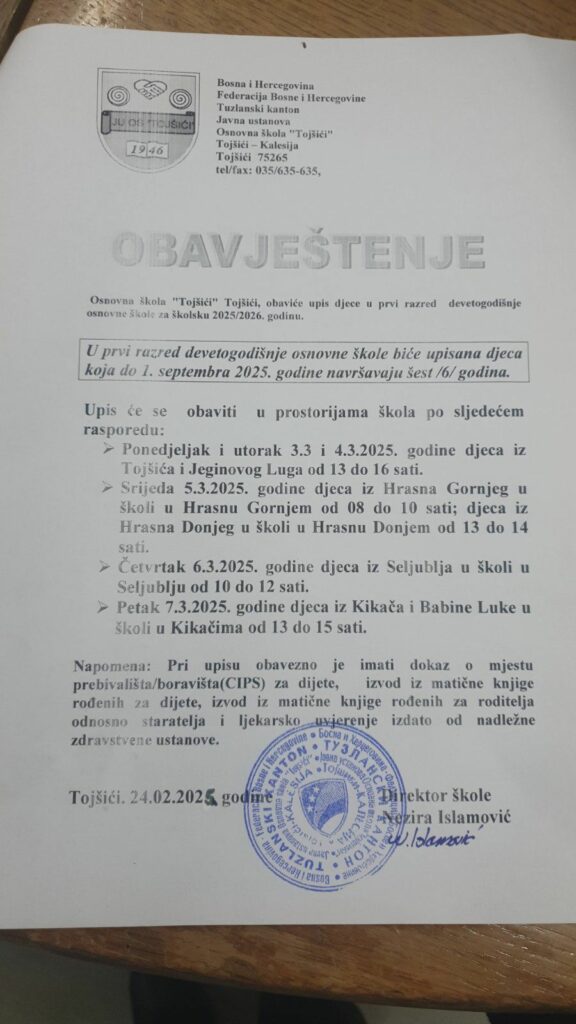 Naredne sedmice počinje upis prvačića u JU OŠ “Tojšići”. Upis u prvi razred za školsku 2025./2026. godinu u Osnovnoj školi “Tojšići” obavljat će se u sljedećim terminima: