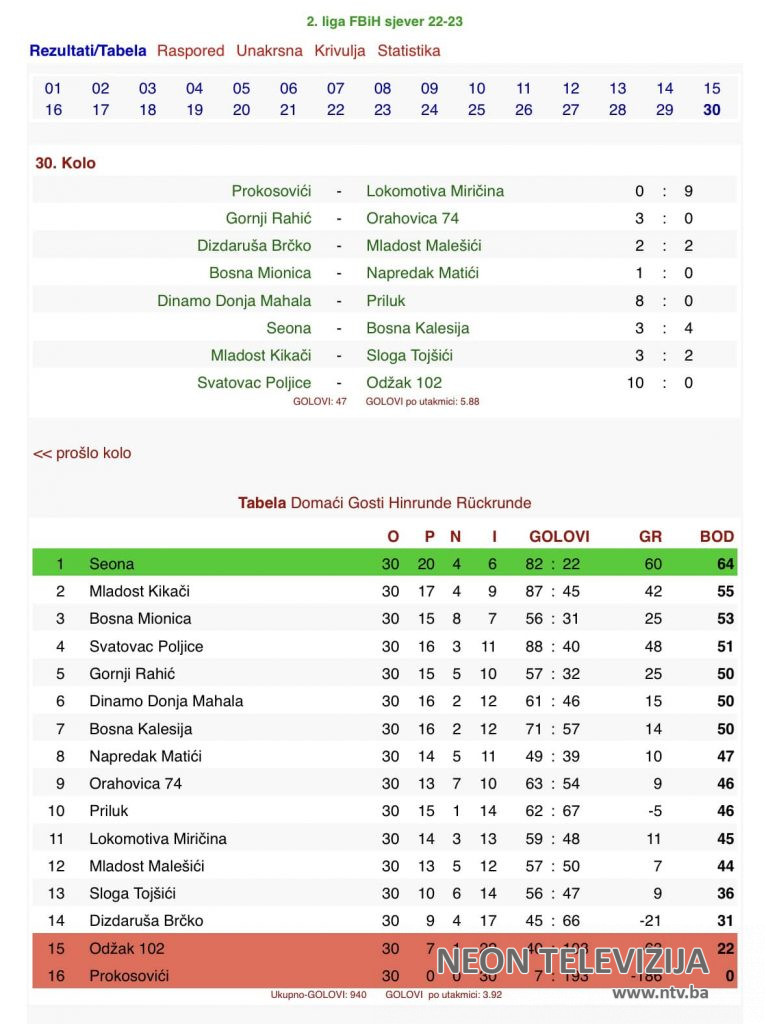 Utakmicama 30.kola završeno je prvenstvo u Drugoj ligi FBiH grupa Sjever.