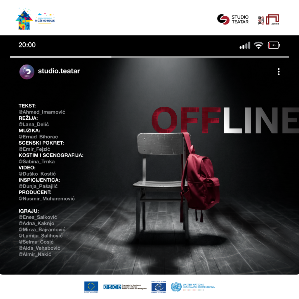 Predstava „Offline“ bavi se temama odrastanja mladih u savremenom digitalnom okruženju, istražujući odnos između stvarnog i virtualnog identiteta, kao i društvene podjele koje oblikuju svakodnevicu mladih generacija. Kroz priču o mladima i njihovim avatarima, otvara važna pitanja odgovornosti u digitalnom prostoru, ali i širem društvenom kontekstu u kojem mladi odrastaju.