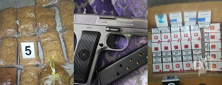 Policijski službenici Uprave policije MUP-a TK-a jučer su, na osnovu Naredbi Općinskih sudova, izvršili pretrese na ukupno 8 lokacija na području Tuzle, Živinica, Kalesije, Gradačca, Srebrenika i Lukavca. Pretresom su pronađeni i oduzeti sljedeći predmeti: automatska puška M-70, pištolj cal 9 mm 112 kom. municije cal. 7,62 i 9 mm, 3 manja pvc. pakovanja u kojima se nalazila materija koja svojim izgledom asociraju na opojnu drogu canabis, osam manjih pvc. smotuljaka u kojima se nalazila materija koja svojim izgledom asocira na opojnu drogu canabis, jedno manje pvc pakovanje u kojoj se nalazila materija koja svojim izgledom asocira na opojnu drogu speed, drobilica sa tragovima materije koji asociraju na opojnu drogu canabis, 14 sjemenki koje asociraju na opojnu drogu canabis, četiri jointa, dvije drobilce, digitalna vaga, veća količina duhanskih prerađevina kao oprema za pakovanje cigareta i to: 28 većih pvc pakovanja rezanog duhana u refuzi, 685 paklica cigareta, 7 mašinica za pakovanje (punjenje) cigareta, drobilica, digitalna vaga, veći broj mobilnih telefona, SIM kartica i dr.