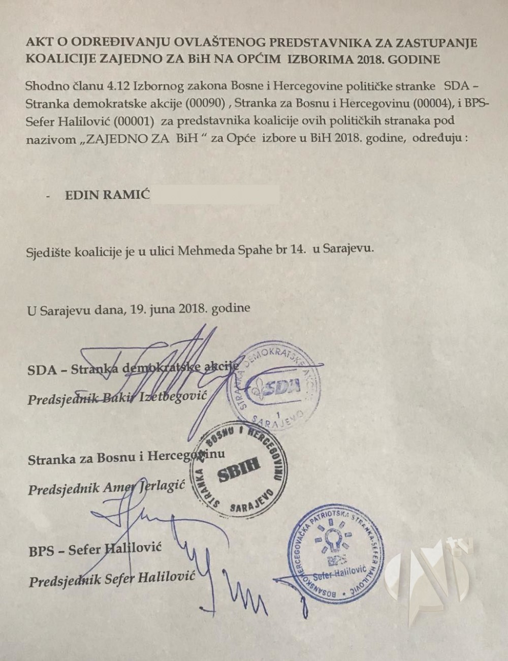 Za ovlaštenog predstavnika Koalicije imenovan je potpredsjednik SDA Edin Ramić, ministar za izbjeglice i raseljene osobe BiH.