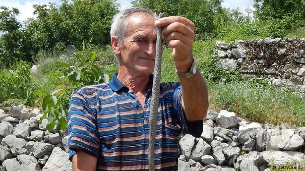 Dok je u velikoj, izbušenoj plastičnoj boci već čuvao dva uhvaćena poskoka, sa svojim bratom Neđeljkom za Deutsche Welle demonstrira hvatanje trećeg.