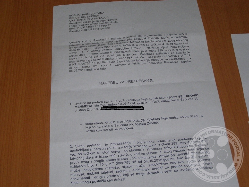 Tokom pretresa, priča Sejednović, bili su korektni i nisu razbacivali stvari, a inspektorica im je rekla da je njihov sin Mehmed, koji studira u Medini, osumnjičen za pripremanje terorističkih napada, te su tvrdili da se on nalazi na ratištu u Siriji.