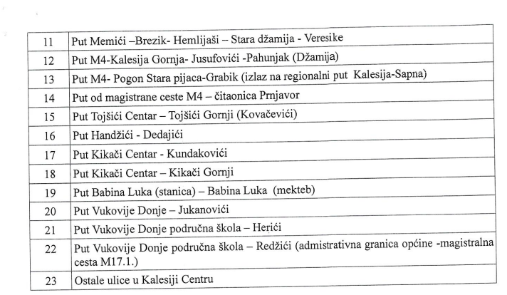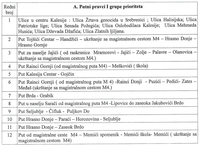 U Programu zimskog održavanja lokalnih i nekategorisanih puteva na području općine Kalesija navedeni su putni pravci koji su raspoređeni u dvije grupe prioriteta pri čemu je prednost za intervencije data putevima koji povezuju najudaljenije mjesne zajednice sa centrom općine, putevima na kojima se odvija javni linijski prevoz putnika (autobuski prevoz), kao i putevima koji povezuju mjesta gdje stanuju bolesni građani općine Kalesija, a koji imaju svakodnevnu potrebu za hemodijalizom ili drugim zdravstvenim tretmanima. Također su navedeni resursi koji će biti angažovani za obavljanje poslova zimskog održavanja lokalnih i nekategorisanih puteva na području općine Kalesija, postupak, te način finansiranja sredstvima koja su obezbijeđena u Budžetu općine Kalesija.
