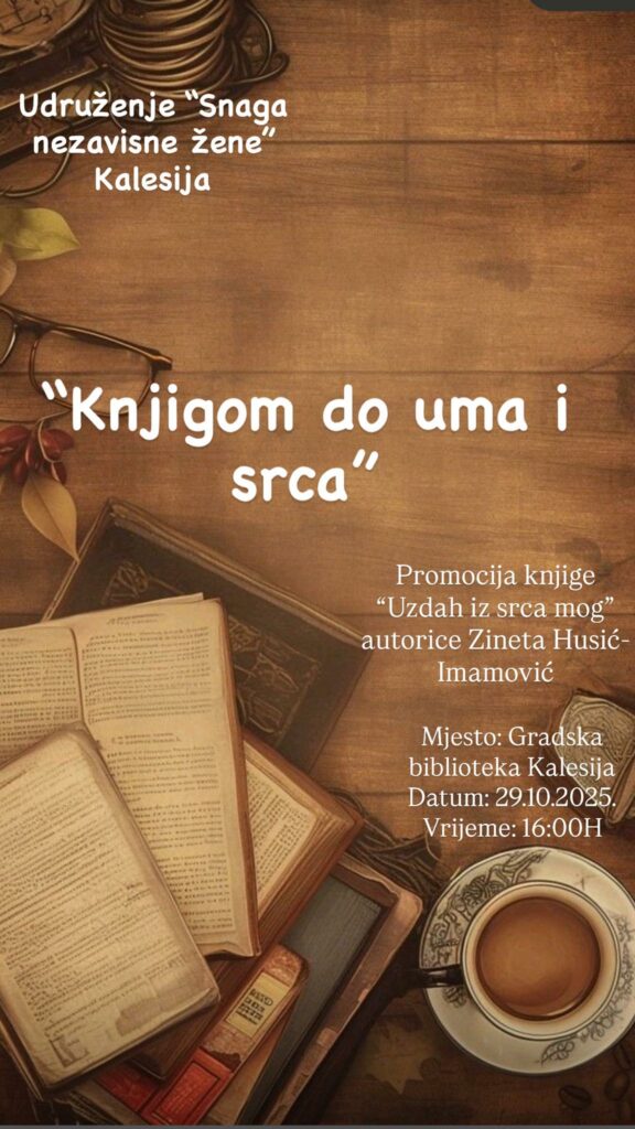 U Gradskoj biblioteci u Kalesiji 29.10.2025. godine bit će upriličena promocija knjige ” Uzdah iz srca mog” autorice Zinete Husić-Imamović.