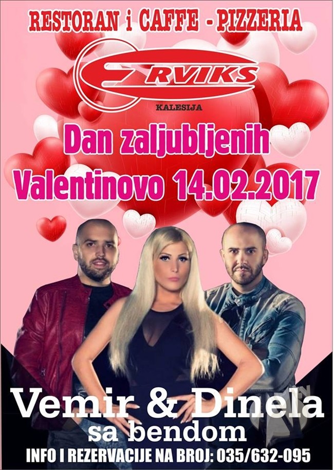 Dan zaljubljenih dočekajte u prijatnom ambijentu restorana i pizzerije Erviks u TC Piemonte u Kalesiji uz muziku uživo i pjevače “Vemira i Dinelu”.