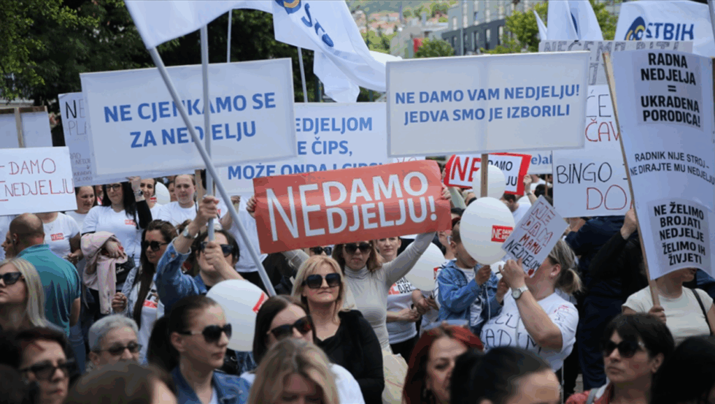 Na protestima Sindikata radnika trgovine i uslužnih djelatnosti BiH (STBiH) okupljeni su nosili transparente na kojima je pisalo: “Ne damo nedjelju”, “Naša nedjelja nije na akciji”, Nećemo 16 ni 18 nedjelja”, “Radna nedjelja = Ukradena porodica”.