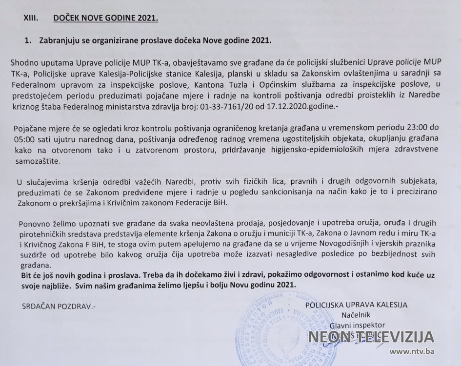 U skladu sa uputama Uprave policije MUP TK-a, Policijska uprava Kalesija-Policijska stanica Kalesija, u cilju zaštite zdravlja naših građana, praćenja situacije i poduzimanja mjera radi sprečavanja bolesti izazvane novim koronavirusom (COVID-19), osjećamo potrebu da Vas upoznamo sa trenutno važećim Naredbama i preporukama koje su i dalje na snazi u vrijeme predstojećih Novogodišnjih i vjerskih praznika.
