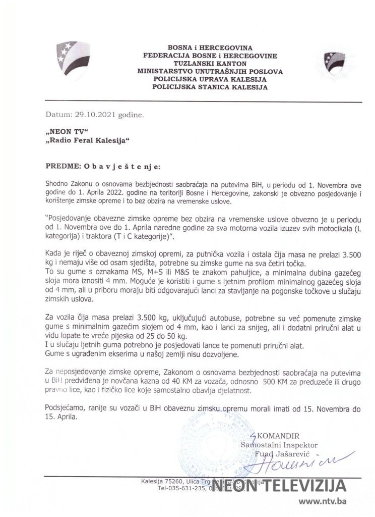 Iz Policijske stanice Kalesija obavještavaju građane da je shodno Zakonu o osnovama bezbjednosti saobraćaja na putevima BiH, u periodu od 1. novembra ove godine do 1. aprila 2022. godine na teritoriji Bosne i Hercegovine, zakonski je obvezno posjedovanje i korištenje zimske opreme i to bez obzira na vremenske uslove.