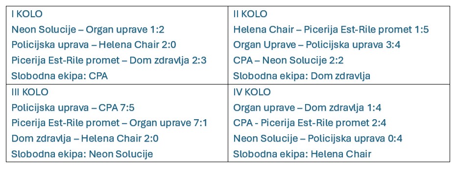 Nakon četiri odigrana kola grupne faze prvo mjesto na tabeli zauzima ekipa Policijska uprava Kalesija, koja je ostvarila stopostotan učinak – četiri pobjede iz četiri utakmice i ukupno 12 bodova. Ekipa Doma zdravlja također je stopostotna u dosadašnjem dijelu takmičenja, s tim da ima utakmicu manje i trenutno je na 9 bodova. Isti broj bodova, ali uz utakmicu više od Doma zdravlja, ima i Picerija Est-Rile promet. Ove tri ekipe vrlo vjerovatno su već osigurale plasman u polufinale, dok će se preostale četiri ekipe boriti za četvrtu poziciju.