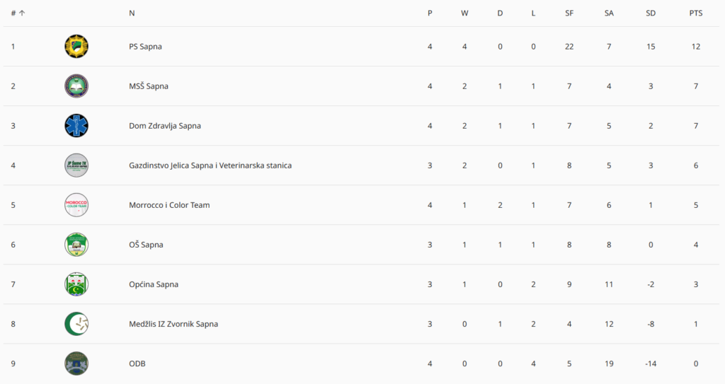 Na tabeli trenutno ubjedljivo prvo mjesto drži ekipa PS Sapna s maksimalnih 12 bodova, pa je sapanjska policija veoma blizu osvajanja pehara namijenjenog pobjedniku.